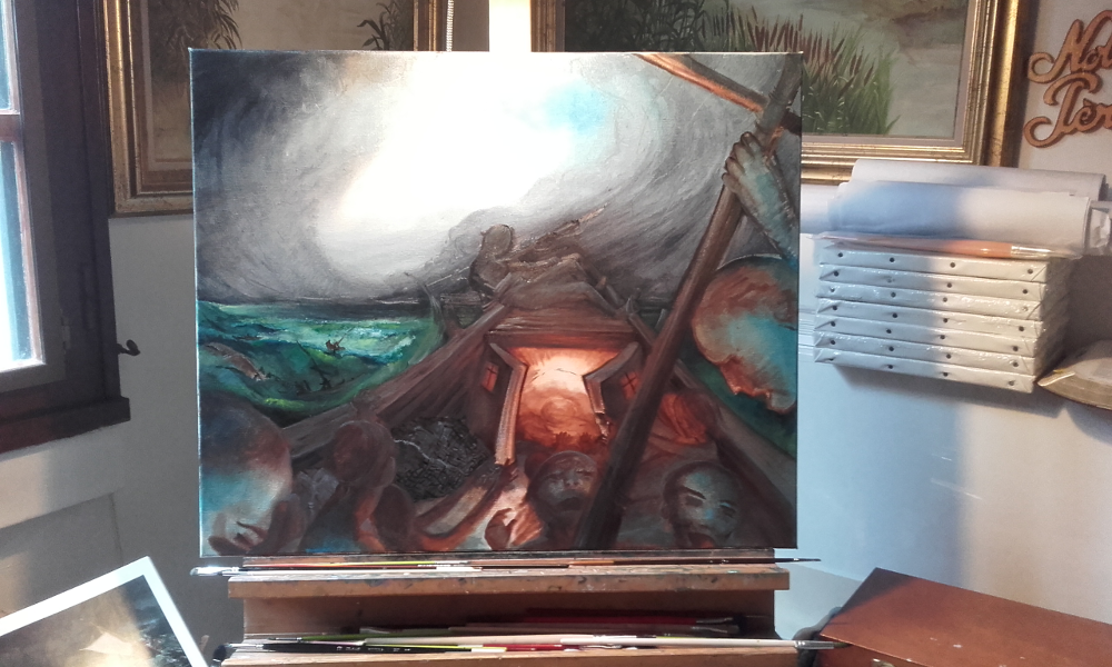 2 : Le temps d'une chanson... un Souffle ! Moi, j'étais partie pour faire une série de tableaux plus clairs, plus joyeux. Mais voilà, j'honore une commande (=> projet ?) et je me retrouve de nouveau à barboter dans ces eaux noirâtres... en pleine tempête ! Le tourbillon de vent semble tellement fort que je peins une voile qui s'envole au loin, devant le timonier (celui qui tient le gouvernail), stupéfait ! Une chanson passe dans ma tête. "Quand le vol de la