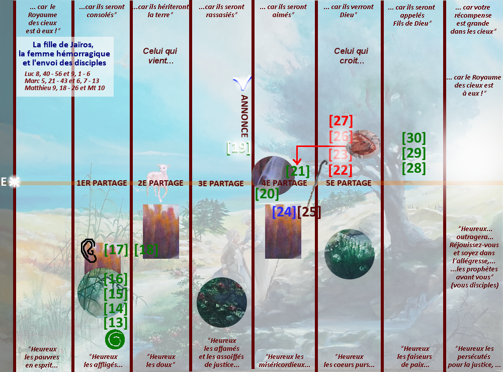 "34 Mais Jésus lui dit : Ma fille, ta foi t'a sauvée ; va en paix, et sois guérie de ton mal. [33]" (Marc 5, 34) "22 Jésus se retourna [22], et dit, en la voyant [27] : Prends courage, ma fille, ta foi t'a guérie. [32] Et cette femme fut guérie à l'heure même. [33]" (Matthieu 9, 22) |